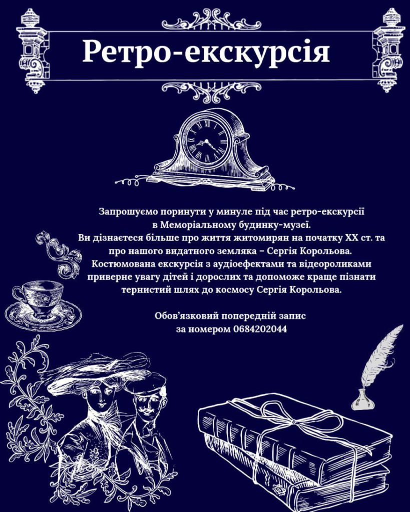 Запрошуємо поринути у минуле під час ретро-екскурсії в Меморіальному будинку-музеї. Ви дізнаєтеся більше про життя житомирян на початку ХХ ст. та про нашого видатного земляка – Сергія Корольова. Костюмована екскурсія з аудіоефектами та відеороликами приверне увагу дітей і дорослих та допоможе краще пізнати тернистий шлях до космосу Сергія Корольова.